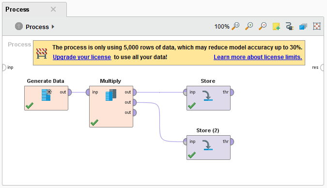 RapidMiner Studio processes data in the form of Example Sets. An Example Set is simply a table created from attributes (columns) and examples (rows). With the introduced data limit operators and views can only process a specific amount of rows which is bound to the installed license.