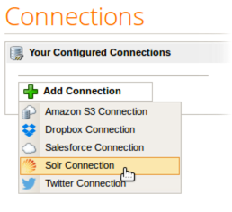 - Hover over the  button to see a list of available connections. Select Solr Connection. button to see a list of available connections. Select Solr Connection.