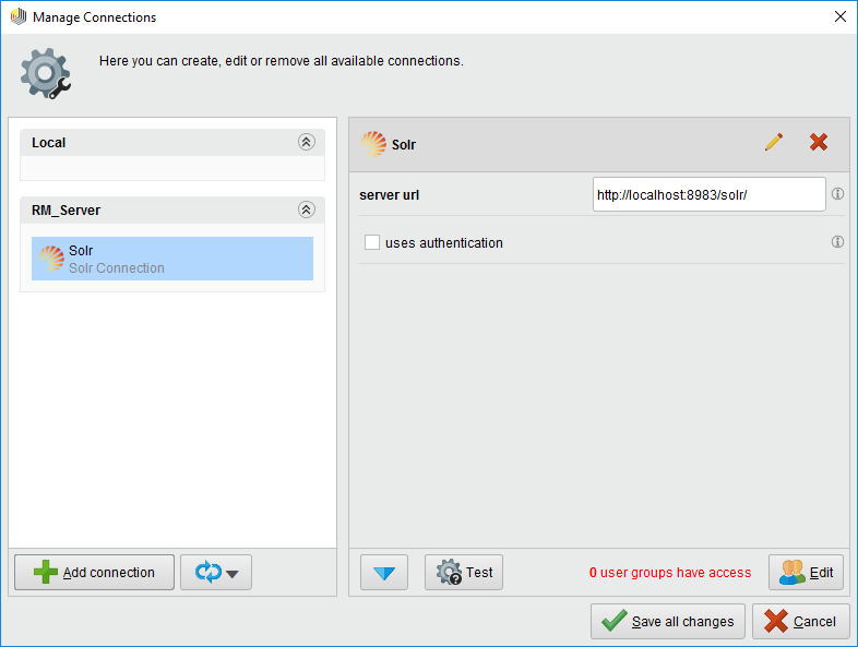 - The Manage Connections window displays the new Solr connection with configuration fields to the right.  - Complete the fields: - Specify the URL for your Solr server, in the form http://<server_IP_address>:<port>/solr.