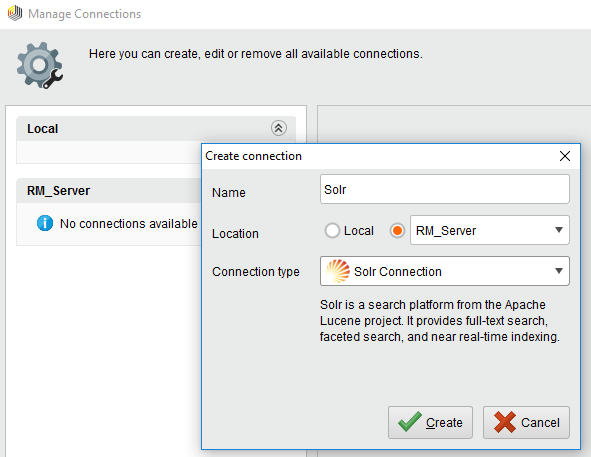 - In the dialog, provide a name for the new connection on RapidMiner Server and set Location to your RapidMiner Server repository name. From the Connection type pull-down, select Solr Connection and then click Create.