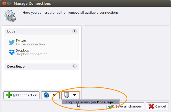 - From the Connections menu, select  Manage Connections to open the Manage Connections dialog box. Log in as admin, if required. Manage Connections to open the Manage Connections dialog box. Log in as admin, if required.