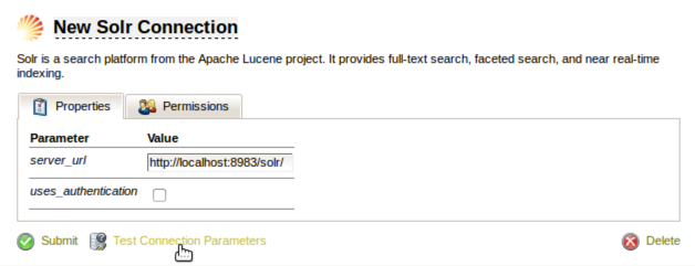 - On the Properties tab, enter the URL for your Solr server. (Select uses_authentication if appropriate.) Test the connection and make any adjustments until the connection is confirmed.