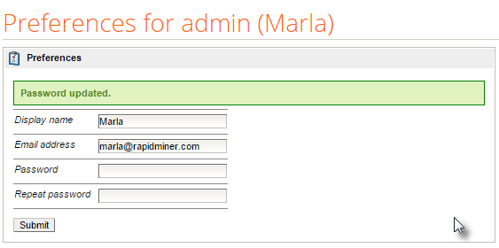 Your first action, once installation is complete, is to change the administrator password. It is important to change the password at this point because connecting to RapidMiner Studio requires that you enter RapidMiner Server login credentials. Changing your credentials later means that you will have to correct this connection as well. To change the password: