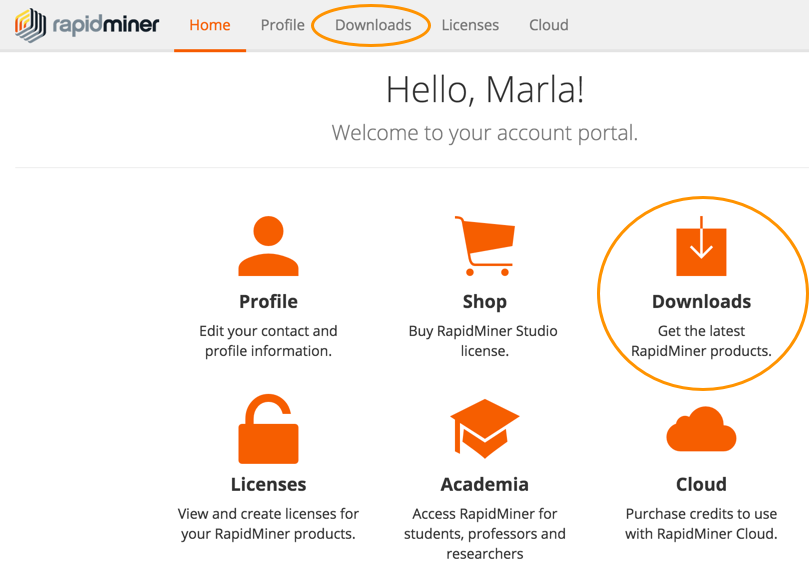 Log into your RapidMiner account and click the Downloads icon or tab: