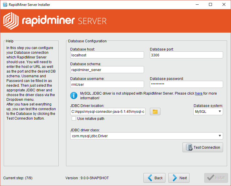 | Database password | Enter the password for the user with login privileges to the RapidMiner Server database. |