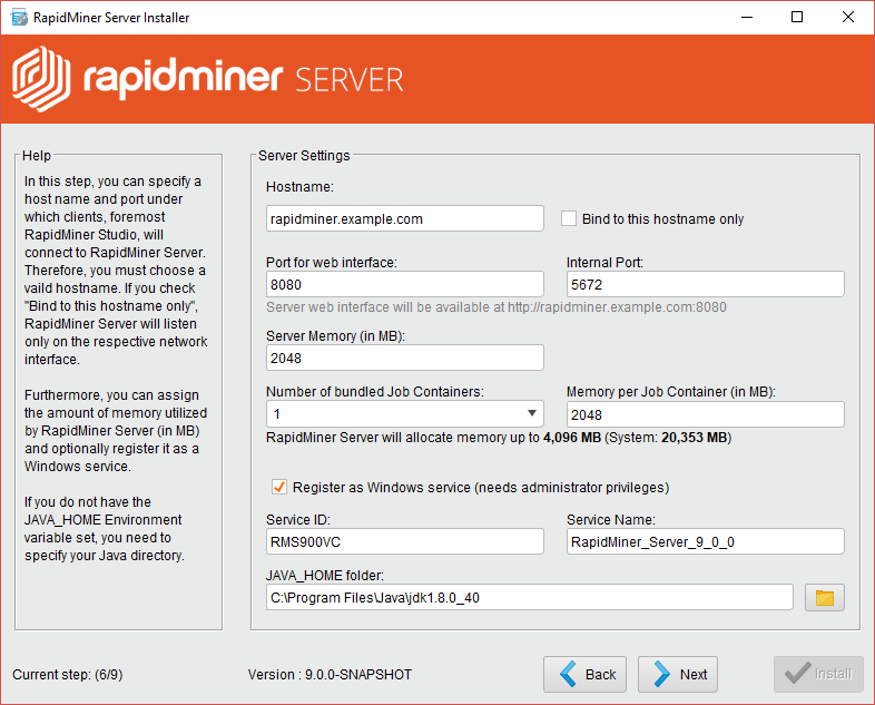 | Service ID | Enter an identifier for the version of RapidMiner Server; this is the ID by which Windows refers to the service. The default value is composed of the RapidMiner Server release and version number. |