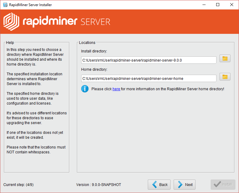 +or%characters and the file system supports UTF-8.Enter or browse to the location where the RapidMiner Server home directory should be located. The home directory is a central place for stored repository content, extensions, logs and configuration files. Please ensure that the folder path does not contain