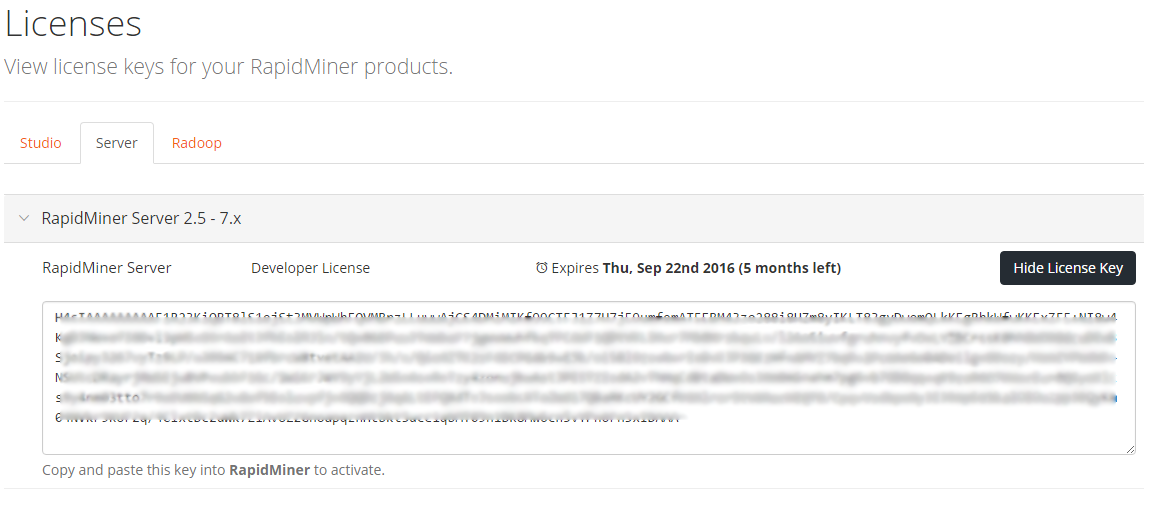 Next. The RapidMiner Server Installer License window opens.From your account portal Licenses page, copy the license key to your clipboard. (See this additional information if you need help copying your key.)